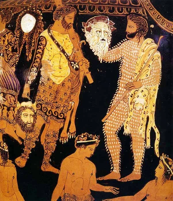 Σεβόμενος τον θρησκευτικό χαρακτήρα των αγώνων, ο αγγειογράφος τιμά τη μόνιμη θεϊκή παρουσία στα δραματικά έργα, μέσω του θεού-προστάτη του ιερού θεατρικού χώρου, και «ιδιοκτήτη» του αρχαίου δράματος. Προσωποποιεί μυθικά πρόσωπα περιστοιχισμένα από τους συντελεστές της παράστασης, στην μπροστινή όψη του κρατήρα, και στην πίσω αναπαριστά μέρος ενός μύθου, με πρωταγωνιστή τον Διόνυσο. Το αγαπητό αγγειογραφικό θέμα του σατυρικού δράματος, καταδεικνύει τη διαφορά της θεατρικής παράστασης από την μυθική πραγματικότητα, παρότι ο διαθέσιμος χώρος και οι συμβάσεις της αγγειογραφικής τεχνικής, δεσμεύουν τον καλλιτέχνη. Αντλώντας έμπνευση από την παράσταση, η φαντασία του, τού επιτρέπει καλλιτεχνικό εμπλουτισμό με μυθολογικές σκηνές και μορφές, πέρα απ’ τις υφιστάμενες.