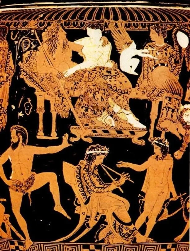 Δίπλα της ένας φτερωτός λευκός Ίμερος, τείνει στέφανο σε άλλη γυναικεία μορφή, καθισμένη στην άκρη της ίδιας κλίνης, με περίτεχνα διακοσμημένη μακρυμάνικη ενδυμασία, και προσωπείο με τιάρα, στο χέρι. Παρότι οι ταυτότητες των γυναικών δεν αποκαλύπτονται, εικάζεται πως πρόκειται για την Αριάδνη, την σύντροφο του Διονύσου, και την προσωποποίηση της Τραγωδίας, της Μούσας ή της Εορτής, ή κατ’ άλλους της προσωποποίησης του παιχνιδιού, Παιδιάδος.