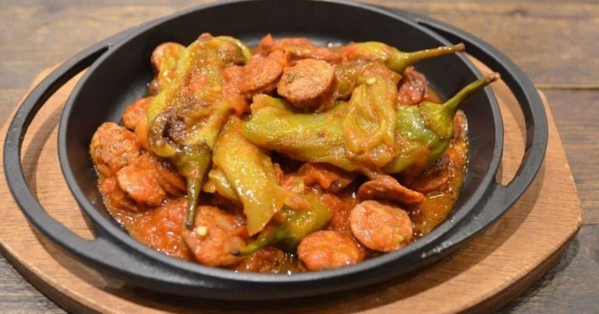 Κόβουμε το λουκάνικο σε χοντρές ροδέλες τις οποίες τηγανίζουμε και από τις δύο πλευρές για 5 λεπτά σε ελάχιστο ελαιόλαδο. Αφαιρούμε τα σπόρια και το κοτσάνι από τις πιπεριές και τις τηγανίζουμε για άλλα 5 λεπτά. Εάν επιλέξουμε να προσθέσουμε μελιτζάνες, αφαιρούμε τα κοτσάνια και μέρος από τη φλούδα, τις ξεπικρίζουμε σε νερό και αλάτι, τις στραγγίζουμε και τις κόβουμε σε χοντρά κομμάτια πριν τις τηγανίσουμε κι αυτές για λίγη ώρα.