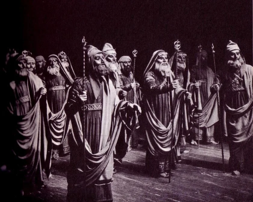 Ο χορός της τραγωδίας Πέρσες από την ιστορική παράσταση, του Κ. Κουν το 1965. (μετάφραση Π. Μουλλά, σκηνικά-κοστούμια Γ. Τσαρούχη, και μουσική Γ. Χρήστου).